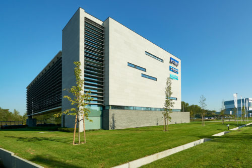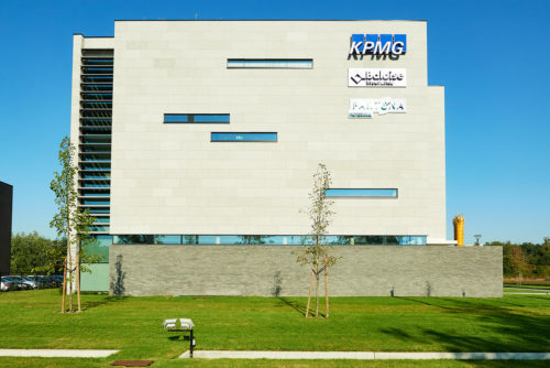De gevels van het gebouw krijgen een award-winning natuurstenen bekleding, die in opengeklapte toestand ook de nodige zonnewering garandeert voor de zuid-westgevel.